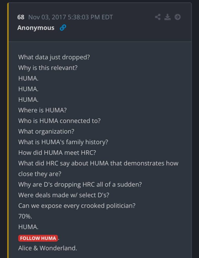 Le 3 Novembre 2017, Q publiait un post intriguant, parlant d’une certaine « Huma ». D’autres posts suggèrent qu’il parle de Huma Abédin. Mais qui est-elle ?