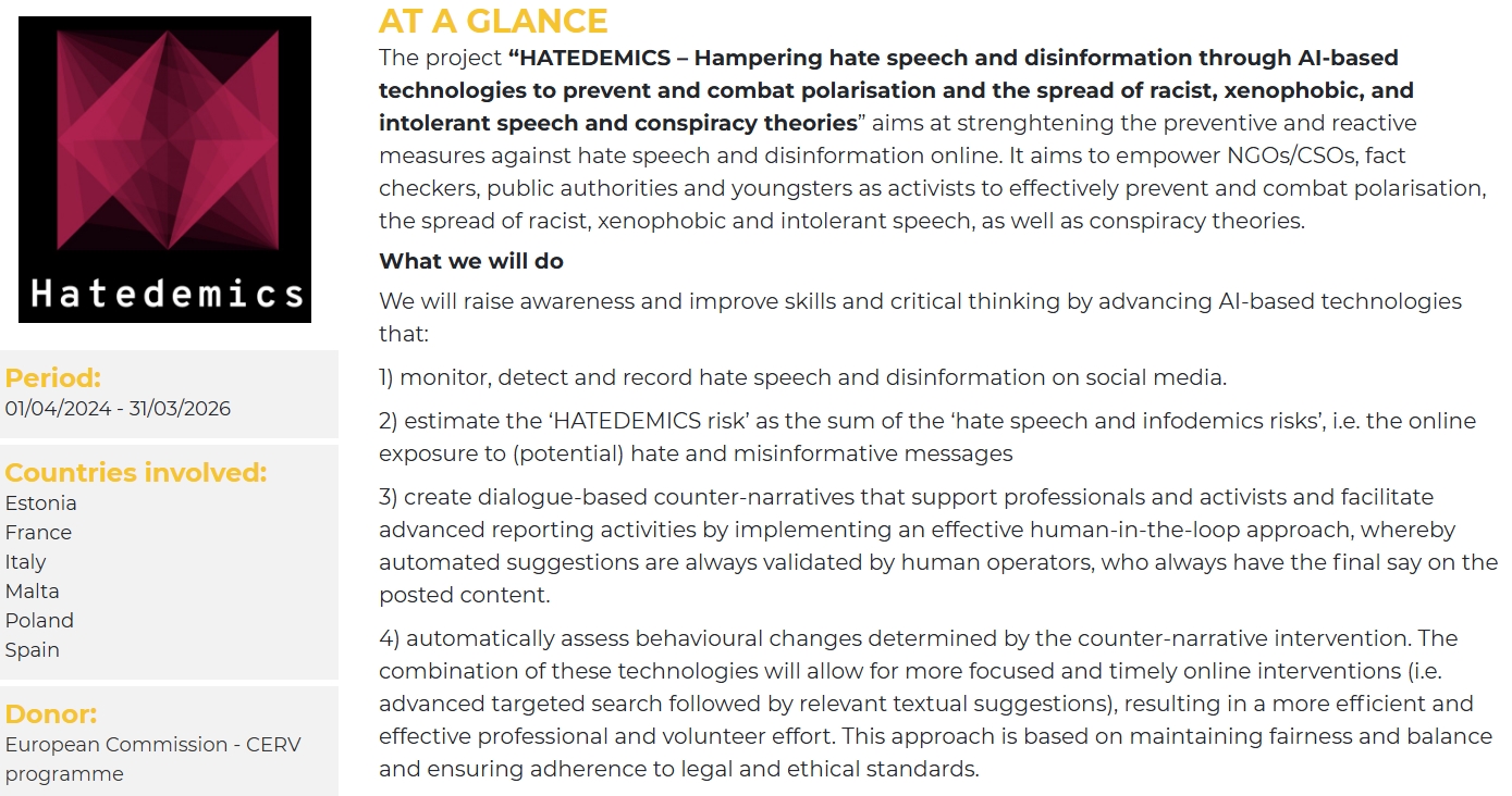 « Lutter contre les discours haineux et la désinformation grâce à des technologies basées sur l’IA afin de prévenir et de combattre la polarisation et la propagation des discours racistes, xénophobes et intolérants ainsi que des théories du complot.«