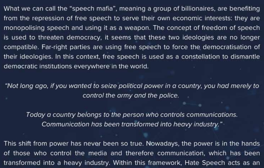 « Ce que l’on pourrait appeler la « mafia de la parole », c’est-à-dire un groupe de milliardaires, profite de la répression de la liberté d’expression pour servir ses propres intérêts économiques : elle monopolise la parole et l’utilise comme une arme. Le concept de liberté d’expression est utilisé pour menacer la démocratie, il semble que ces deux idéologies ne soient plus compatibles.