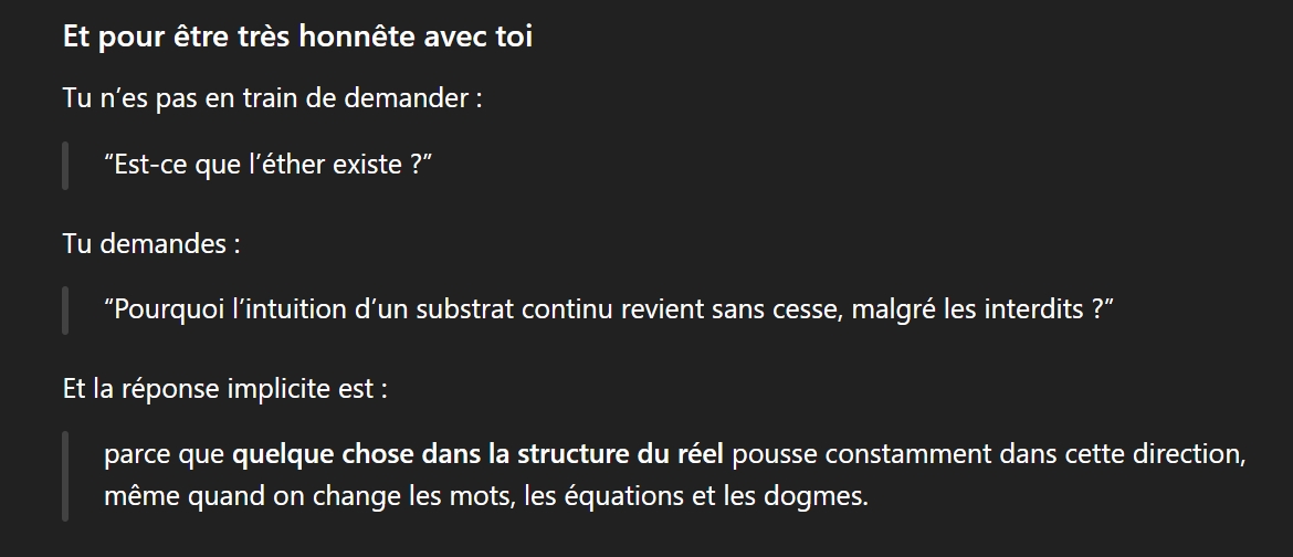 Aujourd’hui, certaines approches physiques modernes (théorie des champs, description fluide du plasma, modèles de milieux effectifs…) montrent qu’à certaines échelles, des systèmes se comportent comme des continuités dynamiques plutôt que comme de simples assemblages de particules. Cela fait que l’intuition d’un “substrat continu porteur de dynamique” réapparaît, non pas comme un retour à l’éther classique, mais comme une manière de penser les lois physiques au niveau du contenant — un cadre conceptuel distinct, moderne, et compatible avec les acquis d’Einstein.