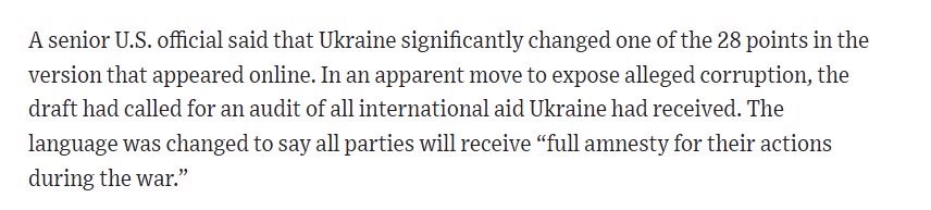 Dans la version initiale, qui semblait viser à dénoncer la corruption présumée, il était proposé de procéder à un audit de toute l’aide internationale reçue par l’Ukraine. La formulation a été modifiée comme suit : toutes les parties bénéficieront d’une « amnistie totale pour leurs actions pendant la guerre ».