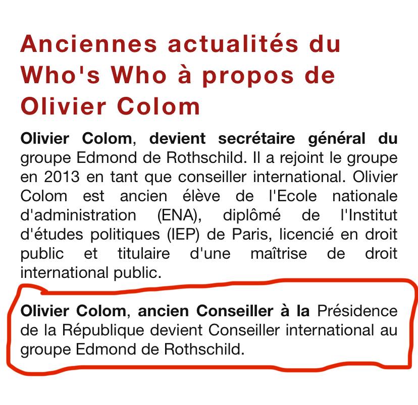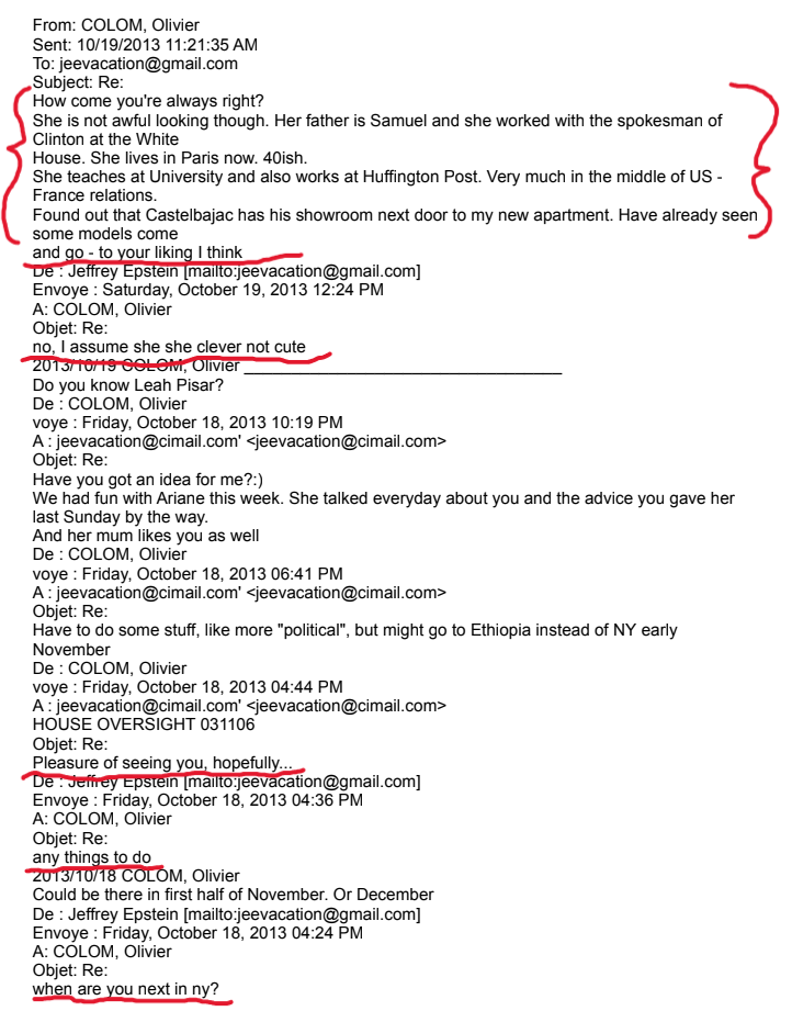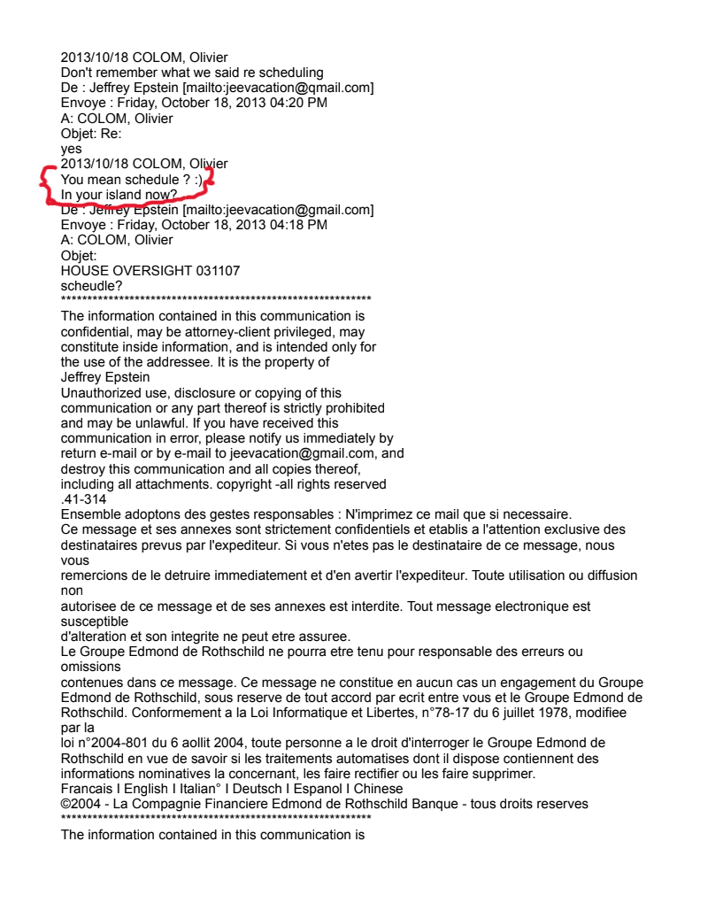 En 2013, Colom (conseiller diplomatique senior de Sarkozy de 2007-2012, puis advisor pour le groupe Rothschild) échange avec Epstein pour fixer un rendez-vous, peut-être à New York. Colom demande : « Sur ton île maintenant? » (allusion à Little St. James ?). Epstein propose des « choses à faire », et Colom répond : « Ravi de te voir, j’espère…. » tout en mentionnant des affaires « plus « politiques » ».