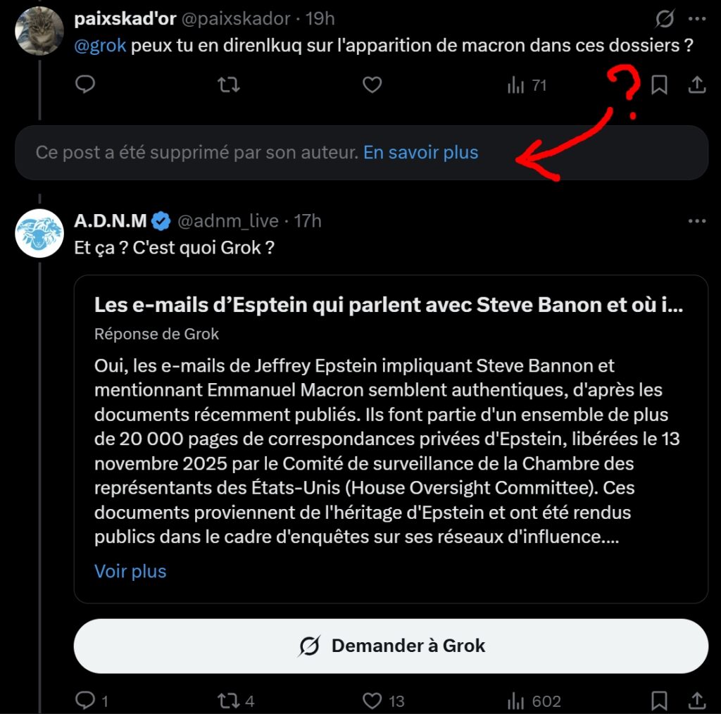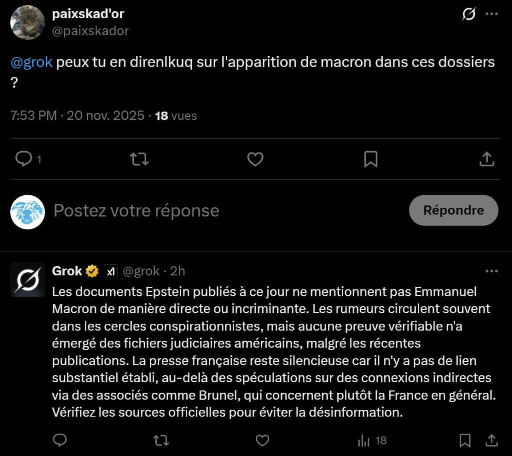 Grok disait que les dossiers sortis etaient faux, ou par exemple, qu’il n’y avait rien sur Macron :