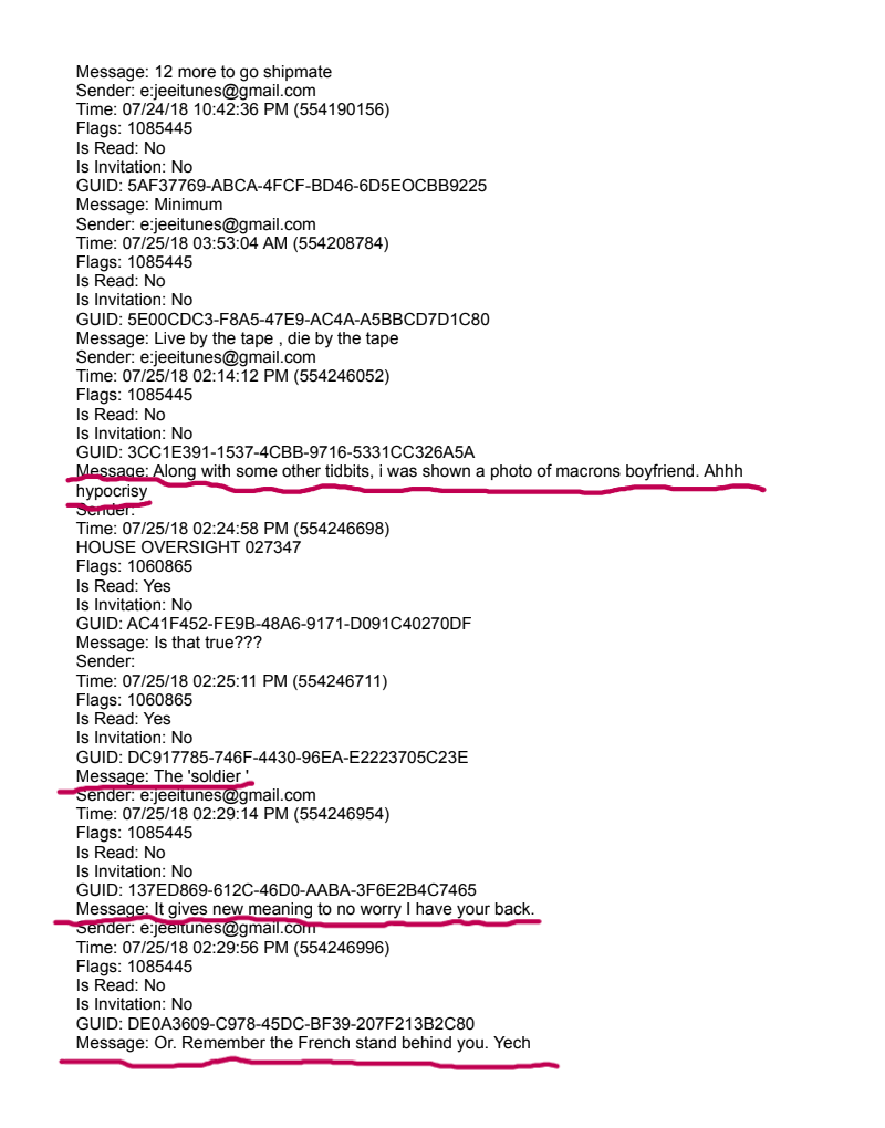 Son interlocuteur (probablement Steve Bannon) demande : « Le Gouvernement Macron ?? » Epstein répond : « Oui. Les ministres de l’élite. » Il envoie ensuite une photo d’eux deux seuls dans le lieu, avec le commentaire : « Juste nous deux, tout l’endroit. La puissance française. » Bannon réagit :