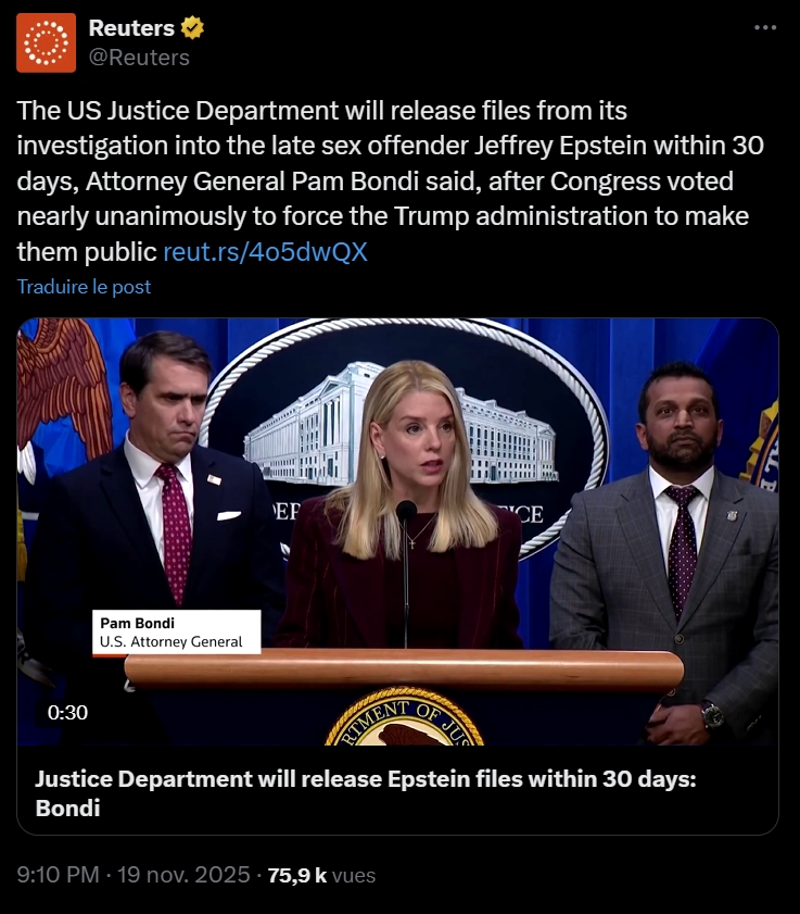REUTERS : Le ministère américain de la Justice publiera dans les 30 jours les dossiers de son enquête sur le défunt délinquant sexuel Jeffrey Epstein, a déclaré la procureure générale Pam Bondi, après que le Congrès ait voté à la quasi-unanimité pour obliger l’administration Trump à les rendre publics.