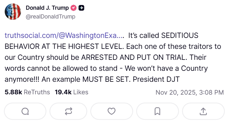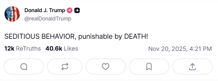 La reponse plus directe de Trump : « COMPORTEMENT SÉDITIEUX, puni de MORT ! »