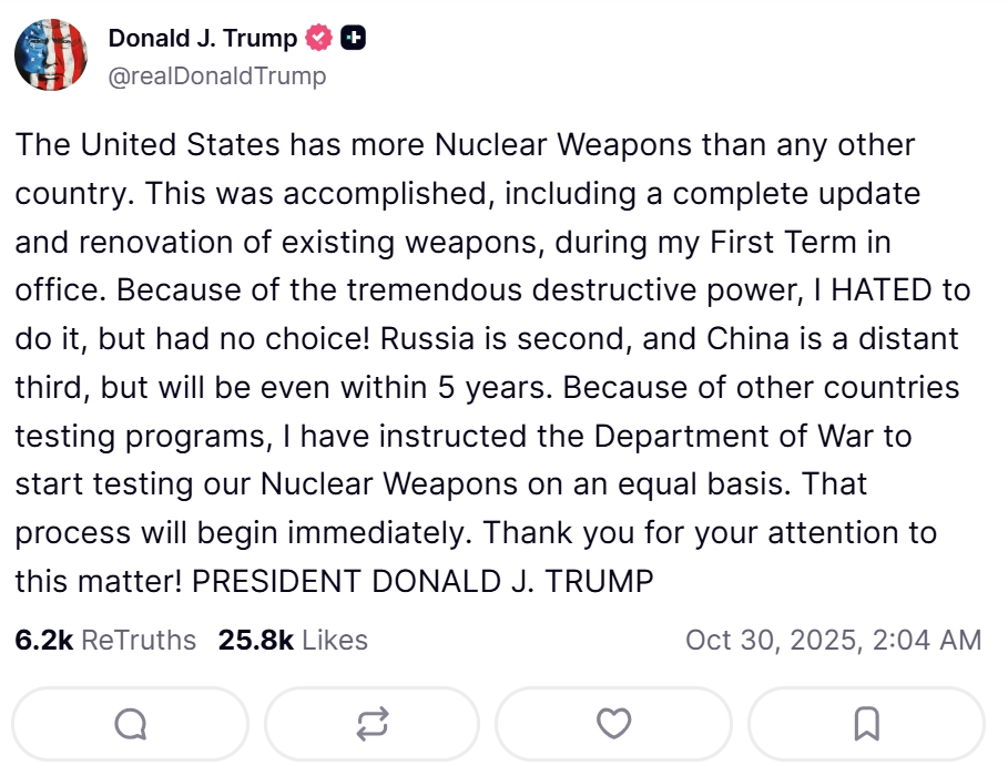 Les États-Unis possèdent plus d’armes nucléaires que tout autre pays. Cela a été accompli, y compris la mise à jour et la rénovation complètes des armes existantes, au cours de mon premier mandat. En raison de leur formidable pouvoir destructeur, j’ai DÉTESTÉ le faire, mais je n’avais pas le choix ! La Russie arrive en deuxième position, suivie de loin par la Chine, mais celle-ci rattrapera son retard d’ici cinq ans. En raison des programmes d’essais menés par d’autres pays, j’ai demandé au ministère de la Guerre de commencer à tester nos armes nucléaires sur un pied d’égalité. Ce processus débutera immédiatement. Je vous remercie de votre attention ! LE PRÉSIDENT DONALD J. TRUMP