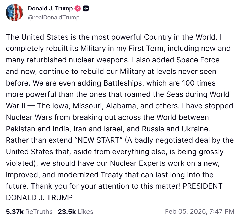 Les États-Unis sont le pays le plus puissant au monde. J’ai entièrement reconstruit son armée au cours de mon premier mandat, notamment en acquérant de nouvelles armes nucléaires et en rénovant de nombreuses autres. J’ai également créé la Force spatiale et je continue aujourd’hui à reconstruire notre armée à un niveau sans précédent. Nous ajoutons même des cuirassés, qui sont 100 fois plus puissants que ceux qui sillonnaient les mers pendant la Seconde Guerre mondiale, comme l’Iowa, le Missouri, l’Alabama et d’autres. J’ai empêché des guerres nucléaires d’éclater à travers le monde entre le Pakistan et l’Inde, l’Iran et Israël, et la Russie et l’Ukraine. Plutôt que de prolonger le « NEW START » (un accord mal négocié par les États-Unis qui, en plus de tout le reste, est gravement violé), nous devrions demander à nos experts nucléaires de travailler sur un nouveau traité amélioré et modernisé qui puisse durer longtemps dans l’avenir. Je vous remercie pour l’attention que vous porterez à cette question ! LE PRÉSIDENT DONALD J. TRUMP