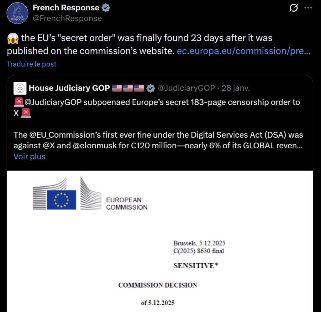 « L’« ordre secret » de l’UE a finalement été découvert 23 jours après sa publication sur le site web de la Commission.«