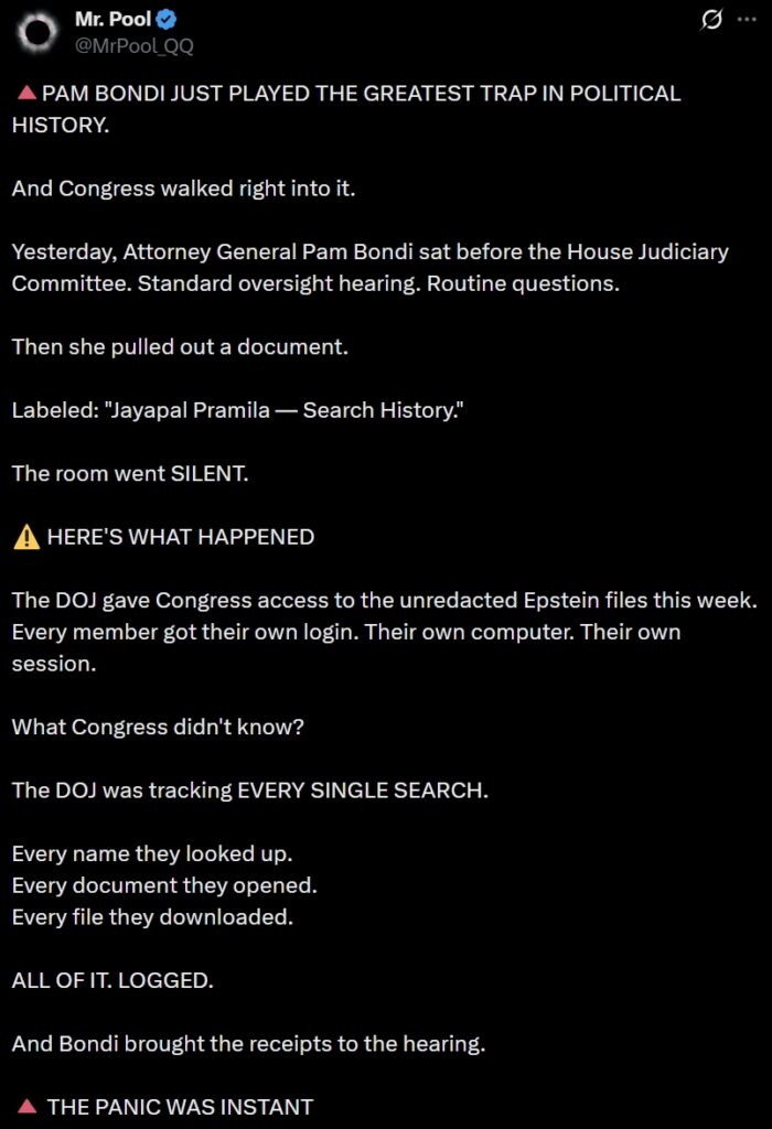 Réfléchissez-y. Bondi n’a pas simplement publié les fichiers. Elle les a publiés sur des ORDINATEURS SURVEILLÉS. Tous les membres du Congrès qui se sont précipités pour consulter les dossiers ont simplement révélé au ministère de la Justice :