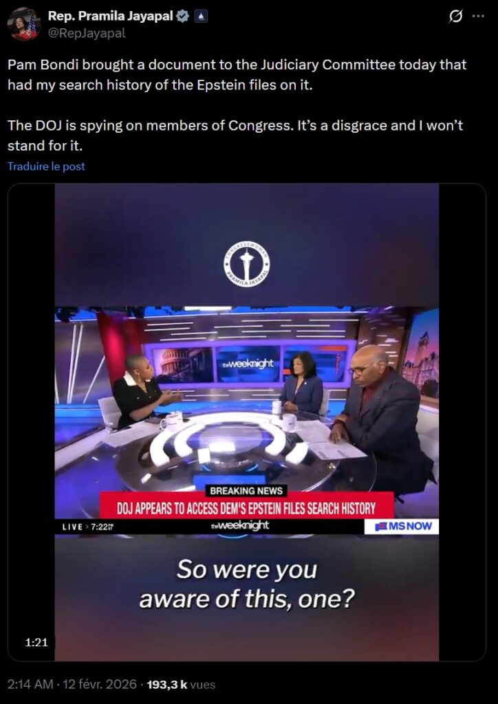 Le représentant Jayapal a qualifié cela d’« espionnage des membres du Congrès ». Le représentant Raskin a accusé Bondi d’« abus de pouvoir flagrant ». Le représentant Moskowitz a déclaré que c’était « suspect et inapproprié ». Ils sont FURIEUX.