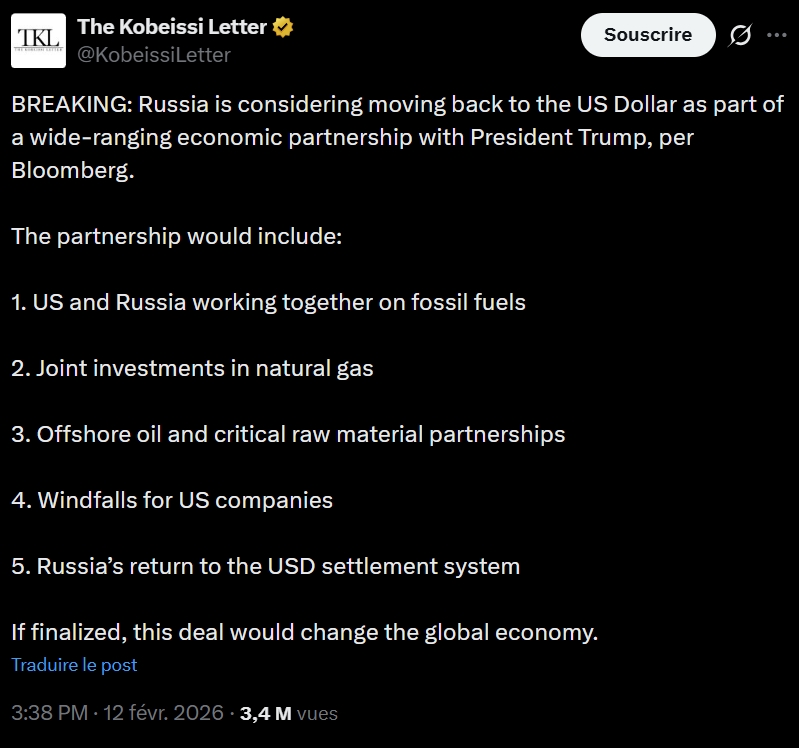 Selon Bloomberg, la Russie envisage de revenir au dollar américain dans le cadre d’un partenariat économique de grande envergure avec le président Trump.