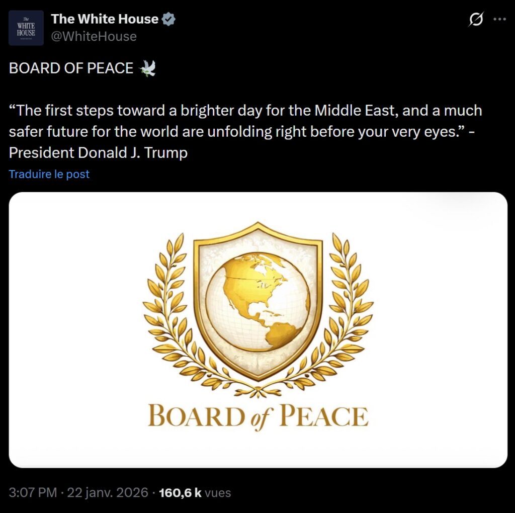 Le « Conseil de Paix » a été créé ce 21 janvier, mais la cérémonie officielle a eu lieu le 22. Il a été rejoint par environ 20-35 pays (selon les sources : Israël, Arabie Saoudite, Turquie, Argentine, Indonésie, Émirats, Hongrie, Pakistan, Belarus, Égypte, Qatar, Albanie, Vietnam, etc.).