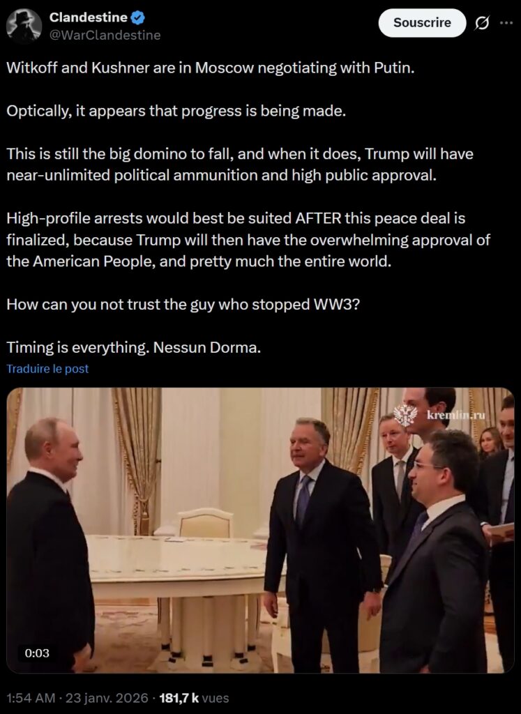 Il serait préférable de procéder à des arrestations très médiatisées APRÈS la conclusion de cet accord de paix, car Trump bénéficiera alors du soutien massif du peuple américain et de la quasi-totalité du monde.